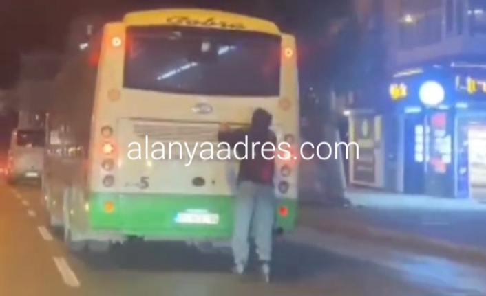 Alanya’da 25 Metrelik Yol olarak da bilinen Şevket Tokuş Caddesi'nde pateniyle halk otobüsüne tutunarak ilerleyen bir genç, hem ölüme meydan okudu hem de trafiği tehlikeye attı. Gencin tehlikeli yolculuğunu görenler, ‘kendini düşünmüyorsan geride kalacak anne babanı, yakınlarını düşün be evladım’ sözleriyle serzenişte bulundu.