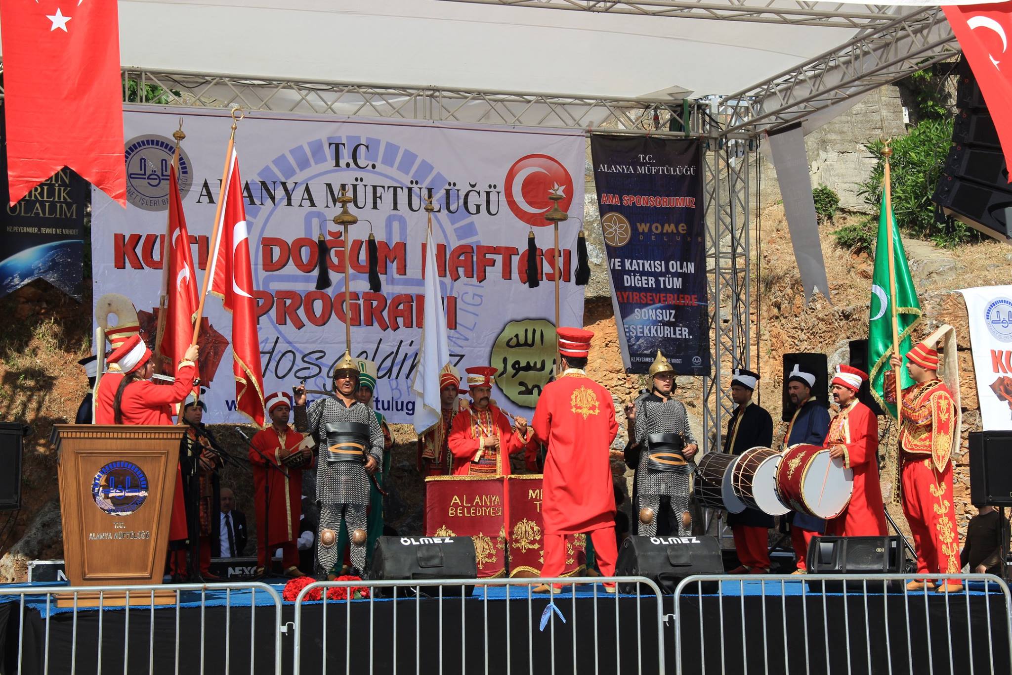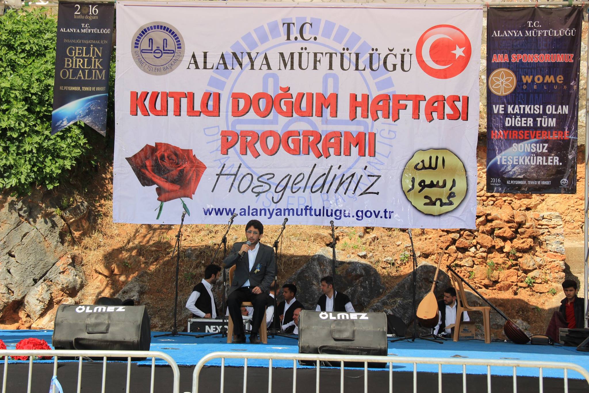 İskele Meydanı’nda Kutlu Doğum Haftası etkinlikleri çerçevesinde düzenlenen program, saygı duruşu ve İstiklal Marşı’nın okunmasıyla başladı. Programın açılış konuşmasını yapan Alanya İlçe Müftüsü Mustafa Topal, 1989 yılından bu yana Diyanet İşleri Başkanlığı tarafından 14-20 Nisan tarihleri arası Peygamber Efendimiz (s.a.v)’in doğumu anısına Kutlu Doğum Haftası olarak kutlandığını belirtti. Alanya İlçe Müftülüğü olarak her yıl Kutlu Doğum Haftası sebebiyle çeşitli etkinlikler düzenlendiğini ifade eden İlçe Müftüsü Topal, “Peygamber Efendimiz’in doğumunun 1445. yılı münasebetiyle düzenlenen Kutlu Doğum Haftası’nın 2016 yılı ana teması “Hz. Peygamber, Tevhid ve Vahdet” olarak belirlenmiştir. Bu temaya bağlı olarak Alanya farklı din, dil ve kültürde insanın yaşadığı bir hoşgörü şehridir” dedi.