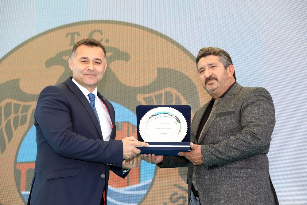Alanya Muhtarlar Derneği Başkanı Hasan Yüksel konuşmasının ardından, Alanya Belediye Başkanı Adem Murat Yücel’e proje ve hizmetleri için teşekkür plaketi takdim etti.