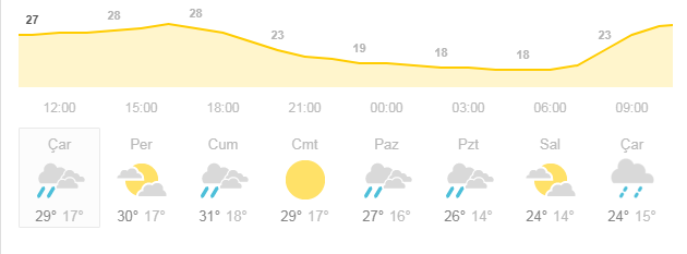 Alanya'da bugün beklenen en yüksek hava sıcaklığı ise 27 derece olması bekleniyor. Yarın ise hava sıcaklığı 29 dereceye çıkacak ama yağmur gelecek. Perşembe güneşli bir gün Alanya'yı beklerken, cuma günü ise yeniden yağış gelecek.