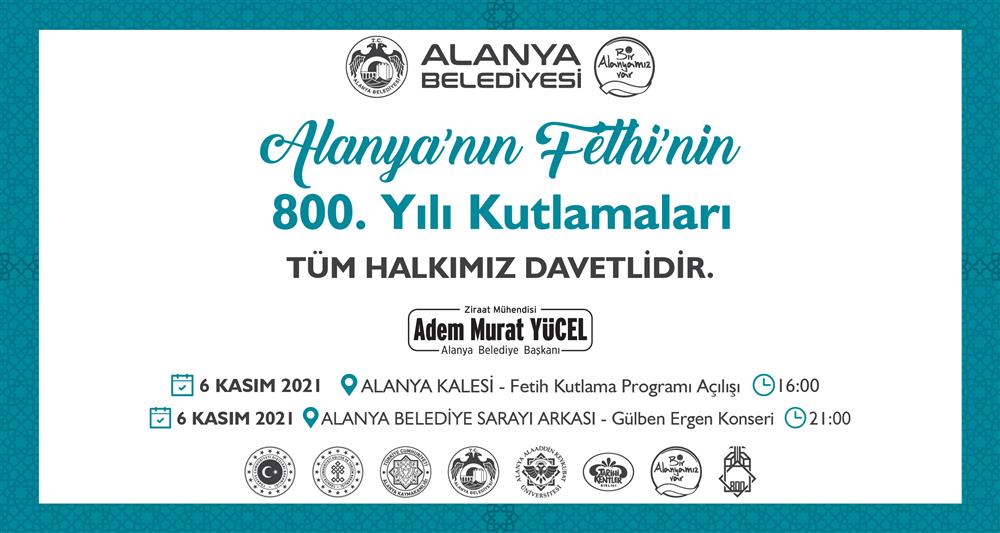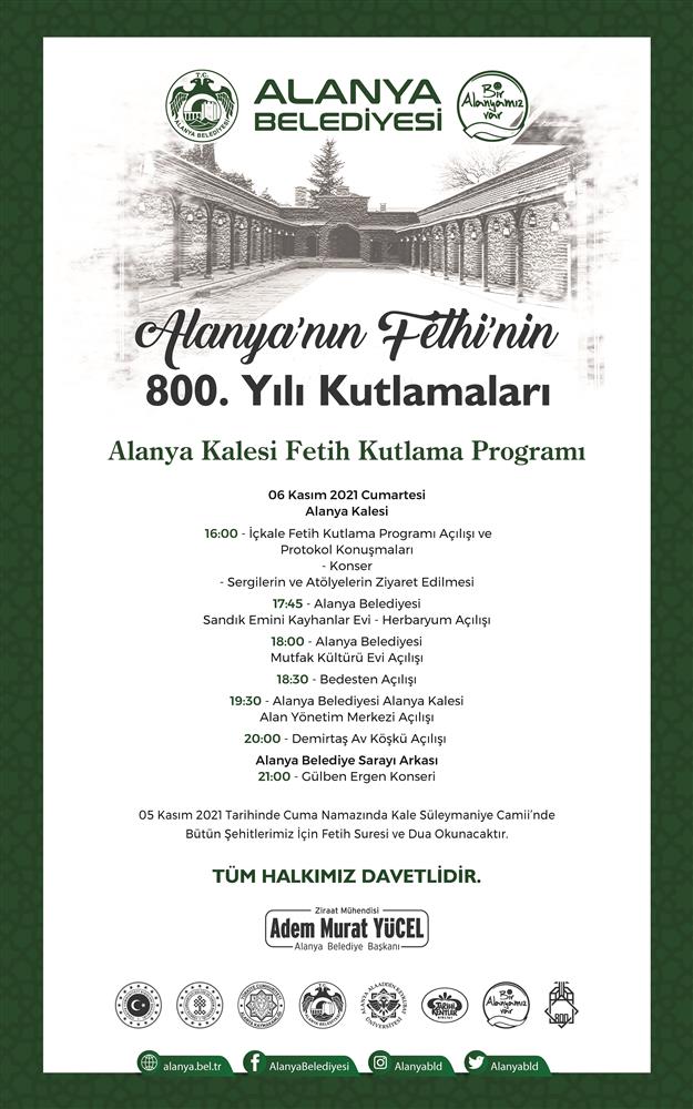 Vatandaşları Alanya’nın Fethinin 800. Yılı kutlamalarına davet eden Alanya Belediye Başkanı Adem Murat Yücel, Alanya’nın değerine değer katacak çalışmalar yaptıklarını ve yapmaya devam edeceklerini söyledi. Yücel; “Dünyanın en huzurlu, en mutlu şehri olan ve çeşitli dillere, dinlere, kültürlere, medeniyetler ev sahipliği yapan Alanya’nın fethinin 800. Yılında ecdadımızın bizlere miras bıraktığı eserler dikkat çekmek için geniş kapsamlı bir program hazırladık ancak pandemi nedeniyle daha sağlıklı yapabilme adına programı sezon sonuna bıraktık, Allah izin verirse Alanya’ya yakışır bir organizasyon yapacağız.” dedi.