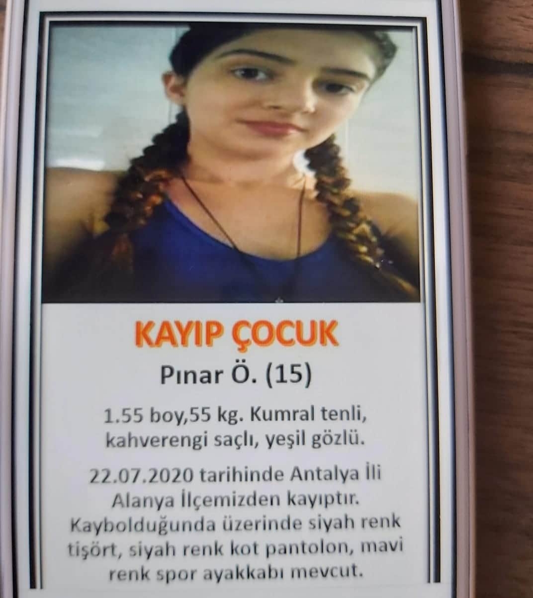 Gazipaşa’da yaşayan 15 yaşındaki Pınar Özkan isimli genç kızdan iki gündür haber alınamıyor. Durumu emniyete bildiren ailesi her yerde kızlarını arıyor. Gazipaşa’da ikamet eden Pınar Özkan’ı görenler 0535 549 32 05 nolu telefondan babasına veya emniyete haber vermeleri istendi.