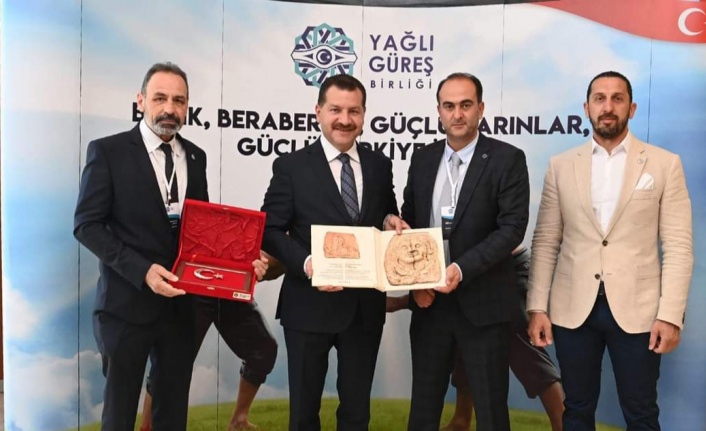 Alanya Belediyesi’ni temsilen Birlik meclisine katılan meclis üyeleri Fevzi Alaattinoğlu, Mehmet Babaoğlu ve Hacı Mevlüt Zavlak meclis sonrasında Yağlı Güreş Düzenleyen Kentler Birliği Başkanlığına yeniden seçilen Yücel Yılmaz’a “Sevgi Taşı” ve filografi sanatı ile yapılmış Türk Bayrağı takdim ederek güreş sporuna desteklerinden dolayı teşekkür etti.