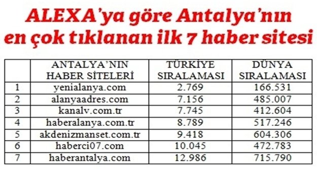 Alanya'nın ilk internet gazetesi olan ve bu yıl 10'uncu yılını kutlayan alanyaadres.com istatistiklerde de zirvede yer aldı. WEB siteleri hakkında bilgileri toolbarı yoluyla toplayarak, ziyaretçi sayıları (trafik) üzerinden sıralama yapan servis Alexa, Antalya'daki en çok tıklanan haber sitelerini açıkladı. Açıklanan listeye göre alanyaadres.com Antalya'da ve Alanya'da 2. sırada yer aldı.