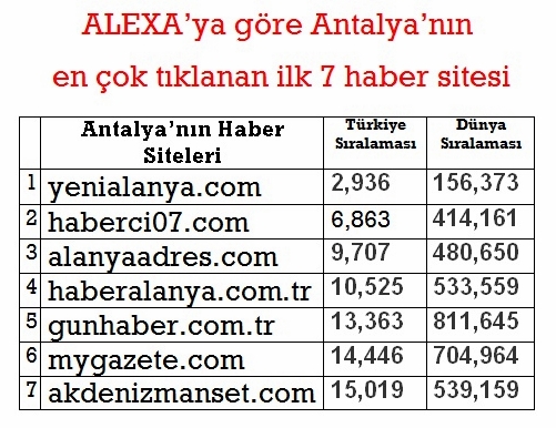 Alanya'nın ilk internet gazetesi olan ve bu yıl 10'uncu yılını kutlayan alanyaadres.com istatistiklerde de zirvede yer aldı. WEB siteleri hakkında bilgileri toolbarı yoluyla toplayarak, ziyaretçi sayıları (trafik) üzerinden sıralama yapan servis Alexa, Antalya'daki en çok tıklanan haber sitelerini açıkladı. Açıklanan listeye göre alanyaadres.com Antalya'da 3'üncü Alanya'da 2'inci sırada yer aldı. Antalya genelinde yenialanya.com ipi gögüslerken, haberalanya.com'da alanyaadres.com'un hemen ardından 4'üncü sırada yer aldı.