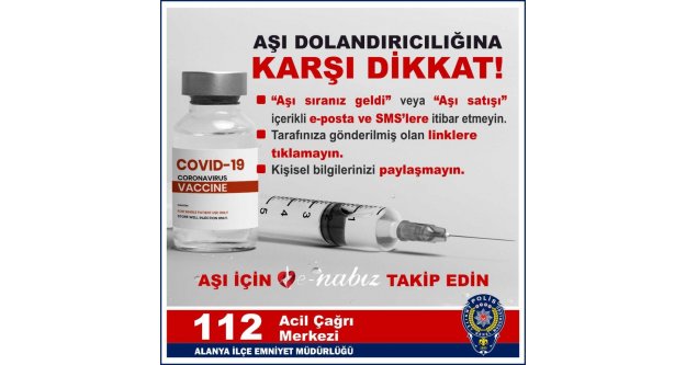 Alanya İlçe Emniyet Müdürlüğü paylaştığı içerikte vatandaşların dolandırıcılara karşı daha dikkatli olmaları gerektiğinin uyarısını yaptı. Ayrıca yapılan paylaşımın devamında “Aşı için e-nabız’ı takip edin” önerisi yapıldı.