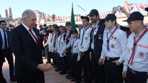 Törenin ardından İBB Başkanı Uysal, itfaiye ve zabıta ekiplerinin selamladı. Ardından da izciler, öğrenciler ve bando takımı ile sohbet ederek onlarla bol bol fotoğraf çektirdi. Gençler Başkan Uysal ile özçekim yapmayı da ihmal etmedi. Başkan Uysal ardından alanın içerisinde elinde İstiklal Marşının yazılı olduğu bir tablo olan yaşlı bir kadın ile sohbet etti. Yaşlı kadının, “Nerelisiniz?” sorusu üzerine Başkan Uysal, “Nereliye benziyorum” diye cevap verdi. Kadın da, “Samsun, Ordu taraflarındansınız” dedi. Bunun üzerine Başkan Uysal, “Deniz var ama o taraftaki değil, Akdeniz'de Antalya Alanyalıyım” demesi güldürdü.