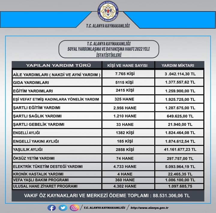 Alanya Kaymakamlığı Sosyal Yardımlaşma ve Dayanışma Vakfı 2022 yılında yaklaşık 90 milyon TL’nin hak sahiplerine dağıtımına aracılık etti.