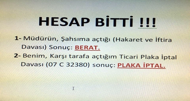 Yaklaşık 2 yıl önce Eski Alanya Şoförler Odası Ali Akkaya’yı rant sağlamakla suçlayan ve Alanya Cumhuriyet Başsavcılığı’na giderek suç duyurusunda bulunan Şirin, o dönem oda başkanı olan Akkaya ile ilgili olarak “Hakkımda aslı ve astarı olmayan iddialarda bulunan Şoförler Odası Başkanı Ali Akkaya ile hukuk önünde hesaplaşacağım. Önce ceza davası talebinde bulundum, bu davanın başlaması ve bitmesi sonucu Akkaya hakkında tazminat davası da açacağım” şeklinde konuşmuştu. Şirin tarafından açılan ceza davası sonuçlandı. Konuyla ilgili açıklama yapan Eski Alanya Şoförler Odası Başkanı Akkaya, “Hesap Bitti! Müdürün şahsıma açtığı hakaret ve iftira davasında sonuç beraat. Benim karşı tarafa açtığım ticari plaka iptal davasında ise sonuç plakanın iptali” dedi. Oda başkanlığı süresince beldelere plaka aktarılmasını hep teşvik ettiğini belirten Akkaya sözlerine şu şekilde devam etti: "Oda Başkanlığım süresince beldelerimize plaka aktarılmasını hep teşvik ettim ve yaklaşık olarak da 100 civarında taksi plakası beldelere aktarılmıştır. Her iki tarafında (beldelerdeki taksicinizde, şehir merkezindeki taksicisinde) memnuniyetine dayanan bu sistem dönemimde başarıyla uygulanmıştır. 2017 yılında Mahmutlar Beldesine taksi aktarılması akabinde gelişen ve basına yansıyan tartışmalar sonucunda, İlçemizde görev yapan Şube Müdürünün tarafıma açmış olduğu 'hakaret ve iftira' davası şahsımın Berat etmesiyle sonuçlanmış ve suçsuz olduğum yüce Türk Adaletince tescillenmiştir. Benimde karşı tarafla ilgili olarak; 07 C 32380 plakalı öğrenci servis plakasının iptali ile ilgili açmış olduğum dava sonuçlanmış ve sözkonusu Öğrenci Servis plakası Hukuka Uyarlılık bulunmadığı gerekçesiyle İPTAL edilmiştir." Güncelleme Tarihi: 18 Şubat 2019, 09:55