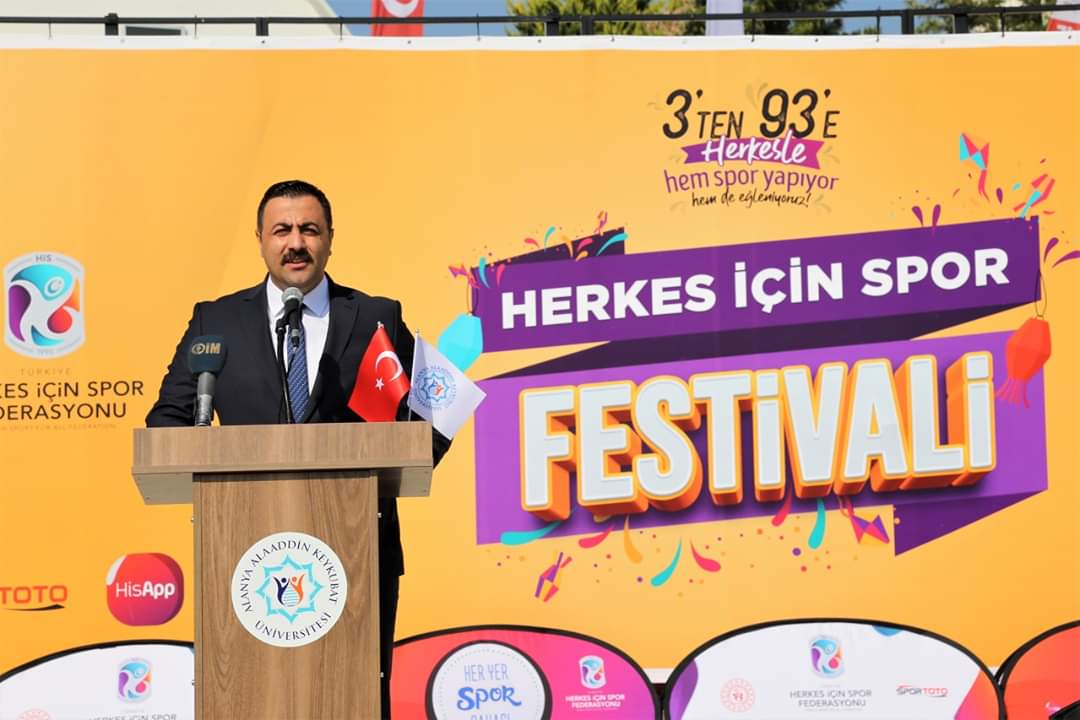 “3’den 93’e Herkesle Hem Spor Yapıyor Hem de Eğleniyoruz!” sloganıyla ALKÜ Anfi Tiyatro’da gerçekleştirilen festivalin açılış konuşmasını gerçekleştiren Türkiye Herkes İçin Spor Federasyonu Başkanı Yasin Bölükbaşı Cumhuriyet’in 96’ıncı yılını kutlayarak sözlerine başladı. Bölükbaşı sözlerine “Başta Gazi Mustafa Kemal Atatürk olmak üzere aziz şehitlerimizi ve gazilerimizi hayırla ve minnetle yâd ediyorum. 96’ıncı yılını kutladığımız bu günlerde biz gönlümüzle kalbimizle gelecek ufka bakarken Cumhuriyet’in hep payidar olacağını söylüyoruz. Tabi bu sadece hamasi bir söz değil. İlelebet payidar olmasını, nasıl olması gerektiğinin içini doldurmalıyız. Bu sadece bilim alanında, savunma sanayinde, eğitim alanında ve diğer tüm göstergelerde önde olmak değil aynı zamanda sağlıklı nesiller yetiştirmek de ilelebet payidar olmanın nasıl olacağının göstergelerinden bir tanesidir. Türk Yurdu her daim bin yıldır saldırılara maruz kalmış bir yurttur. Ancak burada ayakta kalabilmenin tek şartı sağlıklı nesillerle birçok gelen etkiye karşı güçlü durmakla olabilir.” dedi. Bu sebeple Herkes İçin Spor Federasyonu’nun sadece branşlarda başarıyı değil aynı zamanda 3’ten 93’e herkese sağlıklı yaşam biçimini ve hareket etmeyi aşılamak için faaliyet gösterdiğini ifade eden Yasin Bölükbaşı; “Öncelikle bizim hedef kitlemizde en önemli unsur çocuklar ve kadınlardır. Kadınları önemsiyoruz çünkü çocukları yetiştiren ve onları hayata hazırlayan onlara her şeyi aşılayan kişiler annelerimizdir. Onlar çocuklarına sağlıklı yaşam bilincini aşılamakla yükümlülerdir. Herkes İçin Spor Federasyonu’nun vermiş olduğu ilk mesaj evlerin hanımlarına; çocuklarına sağlıklı yaşam bilincini aşılamakla mükellefler.” diye konuştu.