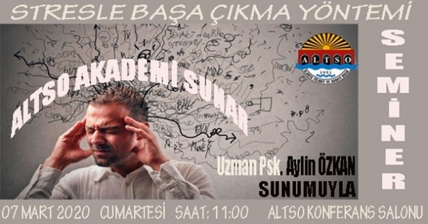 ALTSO Akademi’nin 2020 Yılı 1. Dönem Kişisel Gelişim Seminerleri 07 Mart 2020 Cumartesi günü Uzm. Psk. Aylin Özkan’ın konuşmacı olarak katılacağı ‘Stresle Başa Çıkma Yöntemi’ ile devam ediyor.