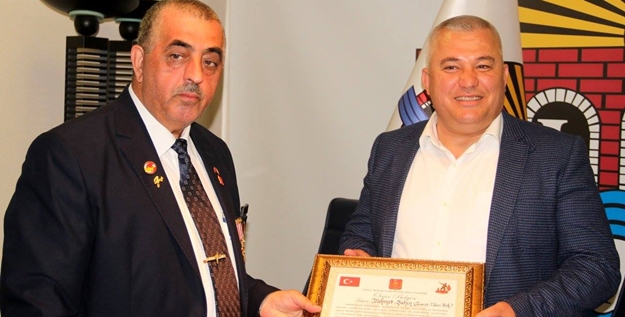 Türkiye Muharip Gaziler Derneği Alanya Temsilcisi Abdullah Yılmaz, yapılan konuşmaların ardından ALTSO Başkanı Mehmet Şahin ve Alanya Sosyal Hizmet Merkezi Müdürü Ahmet Çelik’e yapılan projelerden dolayı Onur Belgesi verdi.