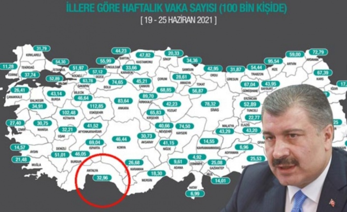 Sağlık Bakanı Fahrettin Koca, 19-26Haziran arasında illere göre her 100 bin kişide görülen Kovid-19 vaka sayılarını açıkladı. Antalya'da ise geçen hafta 27,08 olan vaka artış oranının bugünkü tabloda ise 32,96 olarak tespit edildi.