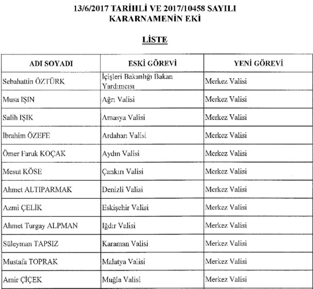 Resmi Gazete'nin bugünkü sayısında yer alan kararnameye göre, İçişleri Bakan Yardımcısı Sebahattin Öztürk ve aralarında Muğla Valisi Amir Çiçek'in de olduğu 19 vali merkeze çekildi.