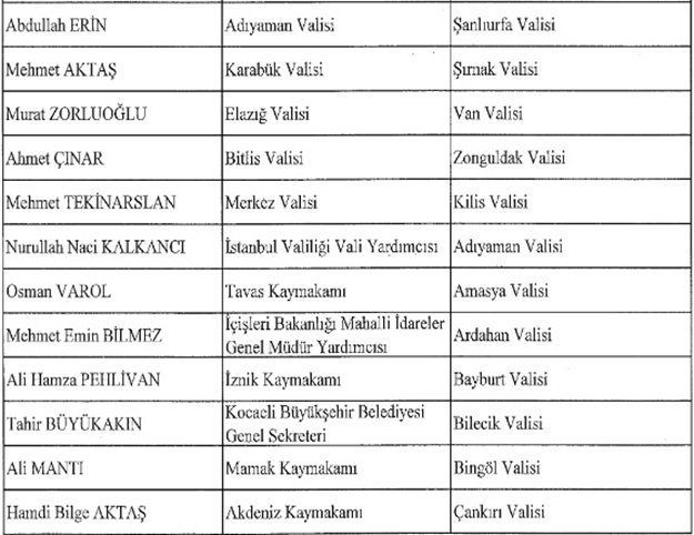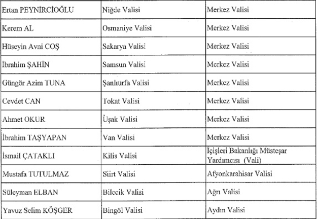 Cumhurbaşkanı Recep Tayyip Erdoğan'ın onayladığı kararname ile, 20 ilin valisi merkeze çekilirken, 20 ile yeni vali atandı, 19 il valisi ise yer değiştirdi.