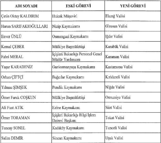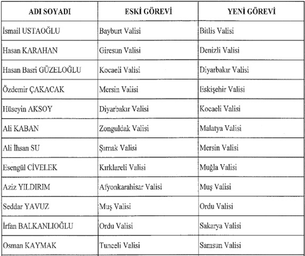 Yeni Muğla Valisi daha önce Kırklareli Valisi olarak görev yapan Esengül Civelek olurken, Antalya Valisi iken önce Erzurum'a, sonra da Denizli'ye atanan Ahmet Altıparmak da merkeze çekilen valilerden oldu. Kararname ile 20 ile yeni vali atanırken, 19 il valisi ise yer değiştirdi.