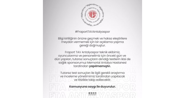 “Bilgi kirliliğinin önüne geçmek ve haksız eleştirilere meydan vermemek için bir açıklama yapma gereği doğmuştur. Antalyaspor teknik ekibimiz, oyuncularımız ve personelimiz için önceki gün ve dün yapılan, tutarsız sonuçların alındığı testlerin ikisi de sağlık sponsorumuz Memorial Antalya Hastanesi tarafından yapılmamıştır. Tutarsız test sonuçlarıyla ilgili gerekli araştırma ve inceleme yönetimimiz tarafından yapılacak ve titizlikle takip edilecektir.”