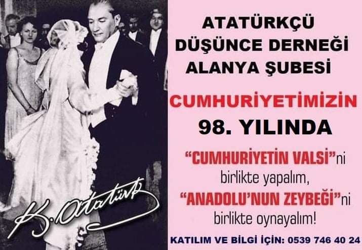 ATATÜRKÇÜ Düşünce Derneği Alanya şubesi 29 Ekim Cumhuriyet Bayramına özel balo yemeği düzenliyor. Etkinliğe katılmak için şubeye 80 TL bağış yapılması gerektiği ve elde edilecek gelirin eğitim için kullanılacağı belirtilen açıklamada şu ifadelere yer verildi: 'Cumhuriyetimizin Kuruluşunun 98. Yıldönümü nedeniyle 27 Ekim 2021 Çarşamba günü Alanya Öğretmen evinde saat 19:00'da düzenlediğimiz sanatçımız Mehmet Acar'ın muzikleriyle Derya - Tuba Erenler'in vals gösterileri ile katılacağı Cumhuriyet Balo Yemeğimize (Şubemize 90 TL bağış karşılığı) bekleriz. Elde edilen gelirin eğitim çalışmalarında kullanılacağı Cumhuriyet Balomuza katılmak isteyenler davetiyeleri dernek binamızdan temin edebilirler. İletişim için: 05397464024 - 511 60 66. Adres : ADD Alanya Şubesi Şekerhane mah Gani gür işhanı kat 2 no 309'