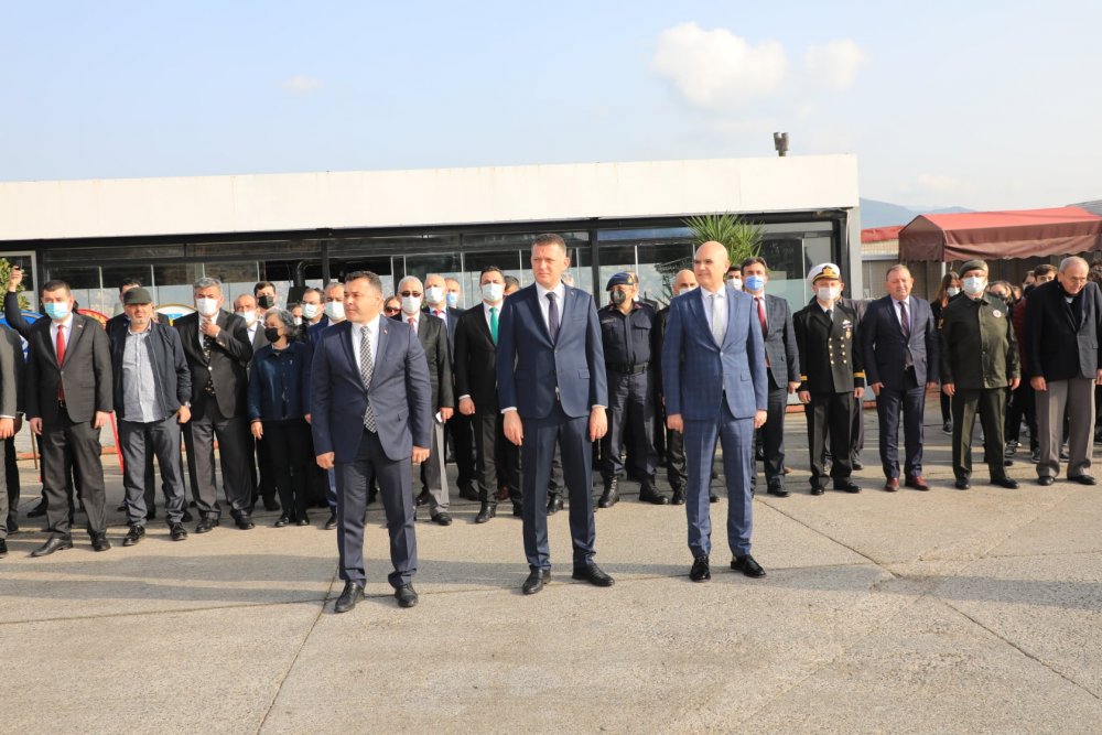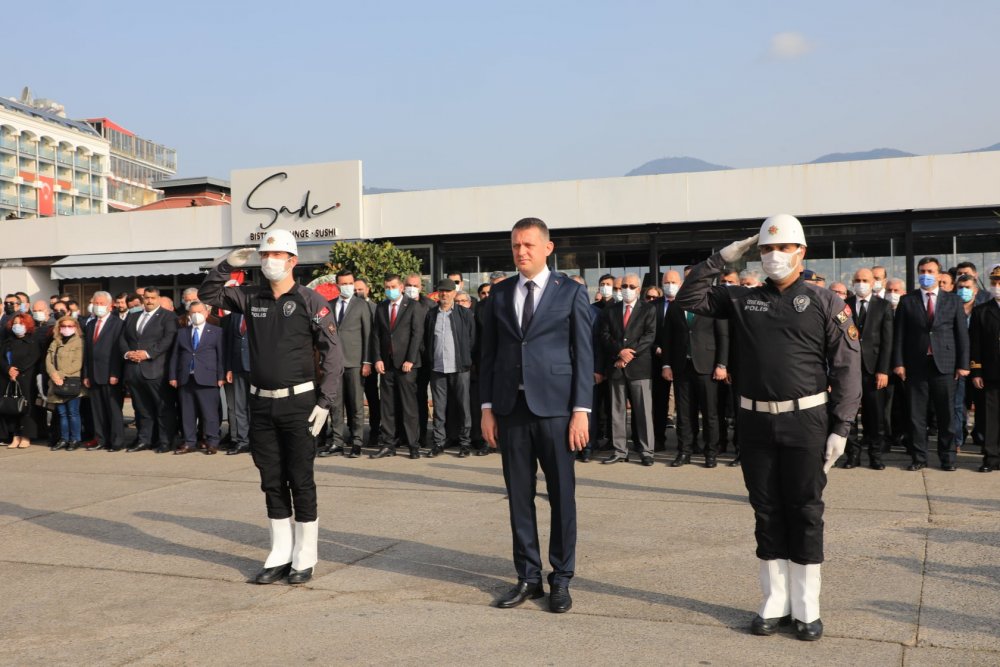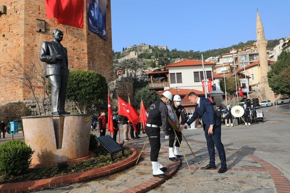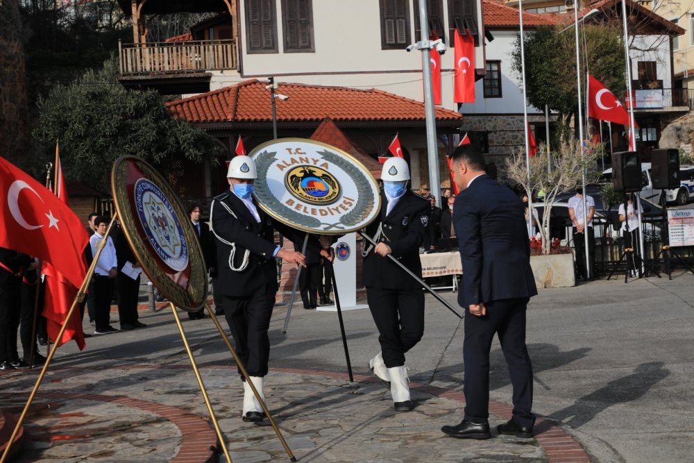 Kaymakam Ürkmezer ve Belediye Başkanı Adem Murat Yücel’in çelenk sunumu ile başlayan tören saygı duruşu ve İstiklal Marşı’nın okunması ile devam etti. Çelenk sunma töreninin ardından Mustafa Kemal Atatürk’ün Alanya’ya gelişinin önemi üzerine konuşma Hüseyin Girenes Fen Lisesi Tarih Öğretmeni Yıldırım Güzel tarafından yapıldı. Ardından günün anlam ve önemine ilişkin konuşmayı Alanya Belediye Başkanı Adem Murat Yücel yaptı.