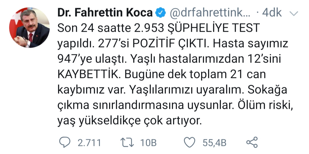 Sağlık Bakanı Fahrettin Koca, yaptığı açıklamada, “Son 24 saatte 2 bin 953 şüpheliye test yapıldı. 277'si pozitif çıktı. Hasta sayımız 947'ye ulaştı. Yaşlı hastalarımızdan 12'sini kaybettik. Bugüne dek toplam 21 can kaybımız var. Yaşlılarımızı uyaralım. Sokağa çıkma sınırlandırmasına uysunlar. Ölüm riski, yaş yükseldikçe çok artıyor” dedi.