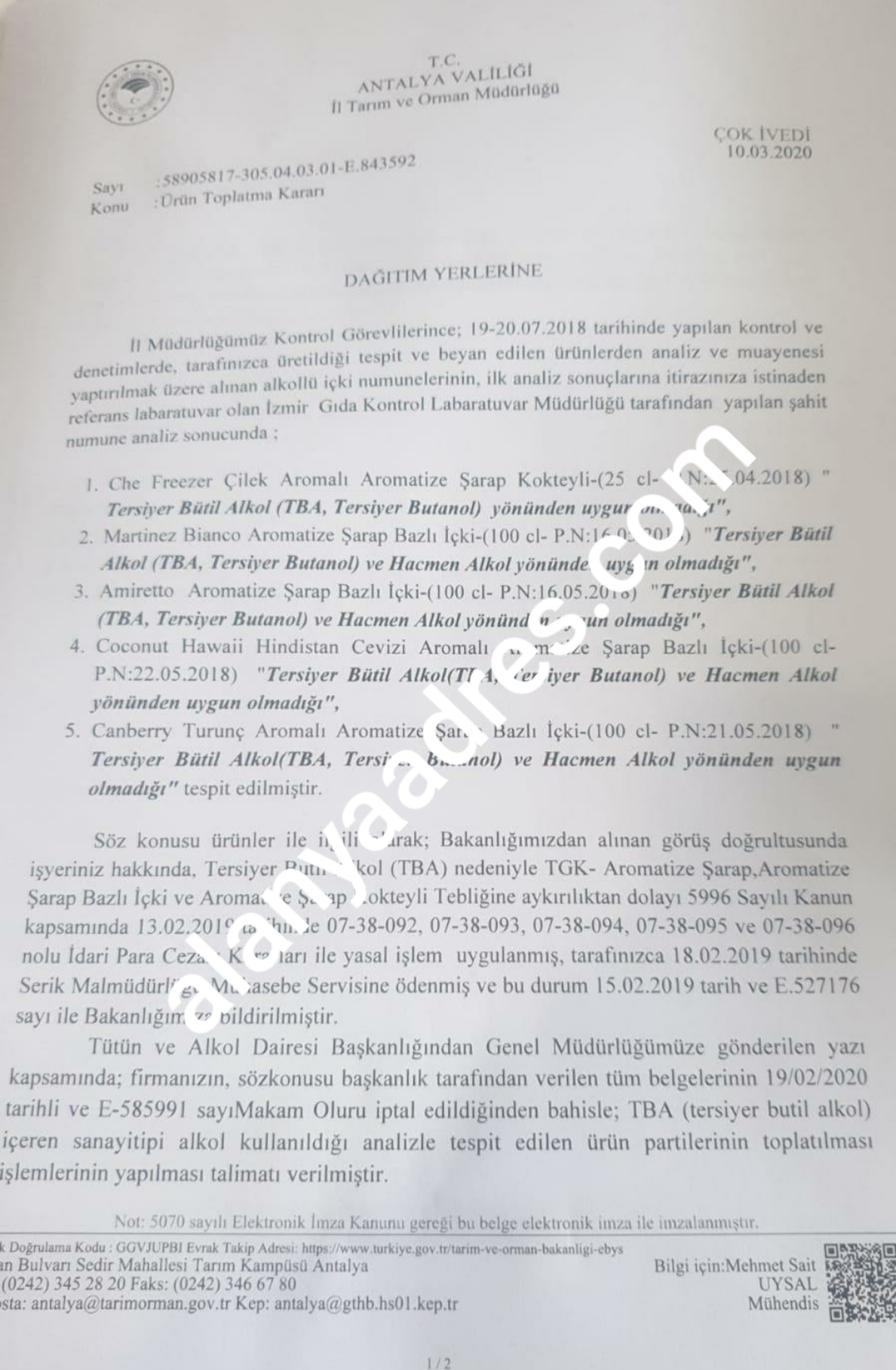 "Ürünlerinizde tersiyer bütil alkol yönünden TGK Aromatize Şarap ve Aromatize Şarap Bazlı içki Aromatize Şarap Bazlı kokteyli tebliğine aykırı olduğu tespit edilmiş olup İdare Yaptırımı tebliğ edilmiş olup ilgili ürünlerin piyasadan toplatılması için verilen 7 günlük süre sona ermiştir. Yazımızda adı ve parti seri numaraları belirtilen ürünlerin piyasa denetim ve kontrollerinde tespit edilmesi halinde 5996 sayılı kanuna göre yasal işlem yapılacaktır" denildi.