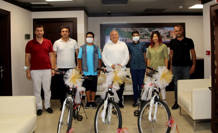 Başkan Şahin, aldıkları puanlarla Alanya’nın gururu olan öğrencilere bisiklet hediye ederken şunları söyledi: “Alanya’mızın Gururu olarak LGS’de 500 Tam Puan Alan ve ismini Türkiye birincileri arasına yazdıran Furkan Metin, 495.42 puan alan Mehmethan Görgülü ve 495. 21 puan alan Ahmet Efe Mutlu kardeşlerimizi aileleri ile birlikte odamızda ağırladık. LGS Şampiyonlarımız ile gurur duyduk ve bu başarının anısına kendilerine birer bisiklet hediye ettik. Kendileri gibi bu başarıda pay sahibi olan aileleri ve öğretmenlerini de tebrik ediyor, bundan sonraki yaşamlarında sonsuz başarılar diliyorum.”