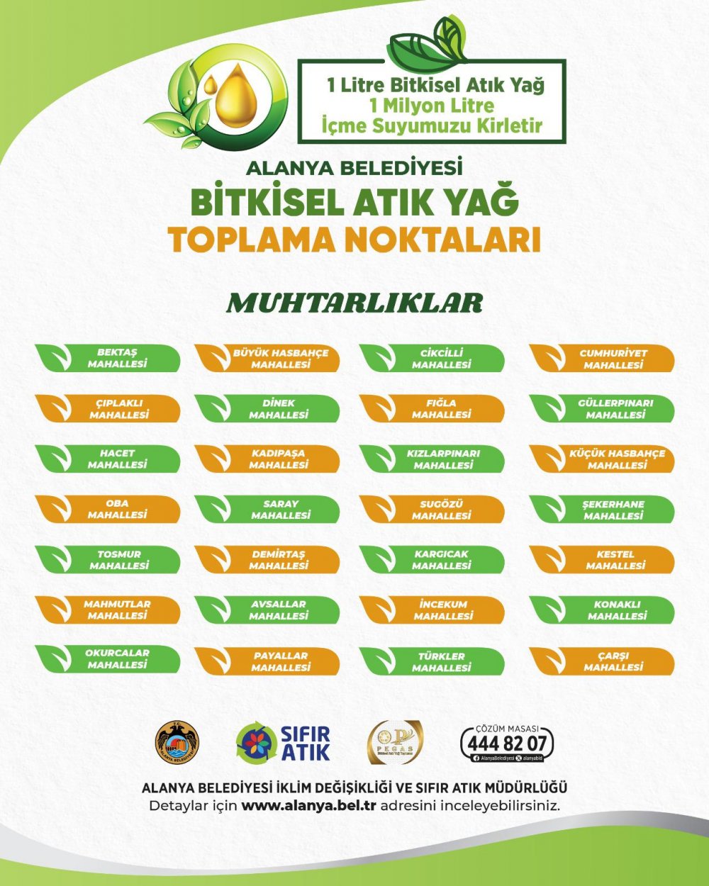 Alanya Belediyesi “Çevreci Kent Yeşil Alanya” olgusunun her kesimde bilinirliğinin artması hedefiyle çalışmalarına devam ediyor. Bitkisel Atık Yağların Kaynağında Ayrı Toplanması Projesi kapsamında konut, hane, okul gibi alanlarda bitkisel atık yağların toplanması amacıyla belediye hizmet birimleri ile projeye destek veren merkez muhtarlık ofisleri, bitkisel atık yağ toplama noktaları olarak belirlendi. Yapılan yeniliklerle güçlenmesi planlanan projede ilk olarak atıl durumda bekleyen malzemeler kullanılarak yapılan ileri dönüşüm çalışması ile toplama noktalarındaki atık yağ toplama bidonları daha estetik ve korunaklı bir kafes içine alındı. Toplama noktaları vatandaşların rahatlıkla ulaşabilmesi amacıyla arttırıldı. Atık toplama noktaları billboardlar ve sosyal medyada duyurulacak.