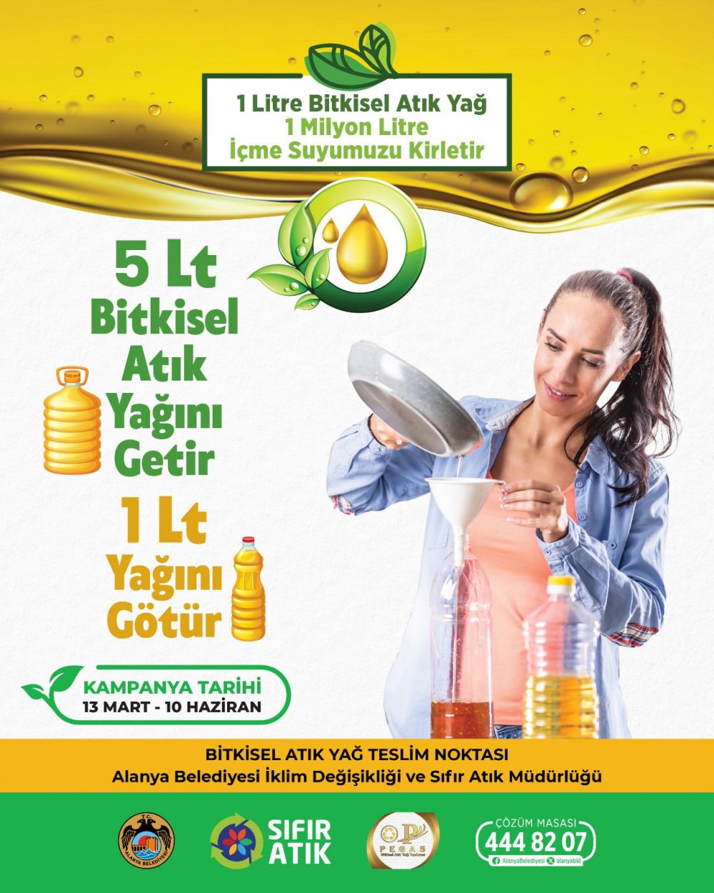 Alanya Belediyesi’nin Bitkisel Atık Yağların Kaynağından Ayrı Toplanması Projesi kapsamında Ödüllü Bitkisel Atık Yağ Kampanyası başladı. Kampanya, 13 Mart-10 Haziran tarihleri arasında gerçekleşecek ve 5 litre bitkisel atık yağ getirenlere, 1 litre bitkisel yağ verilecek.