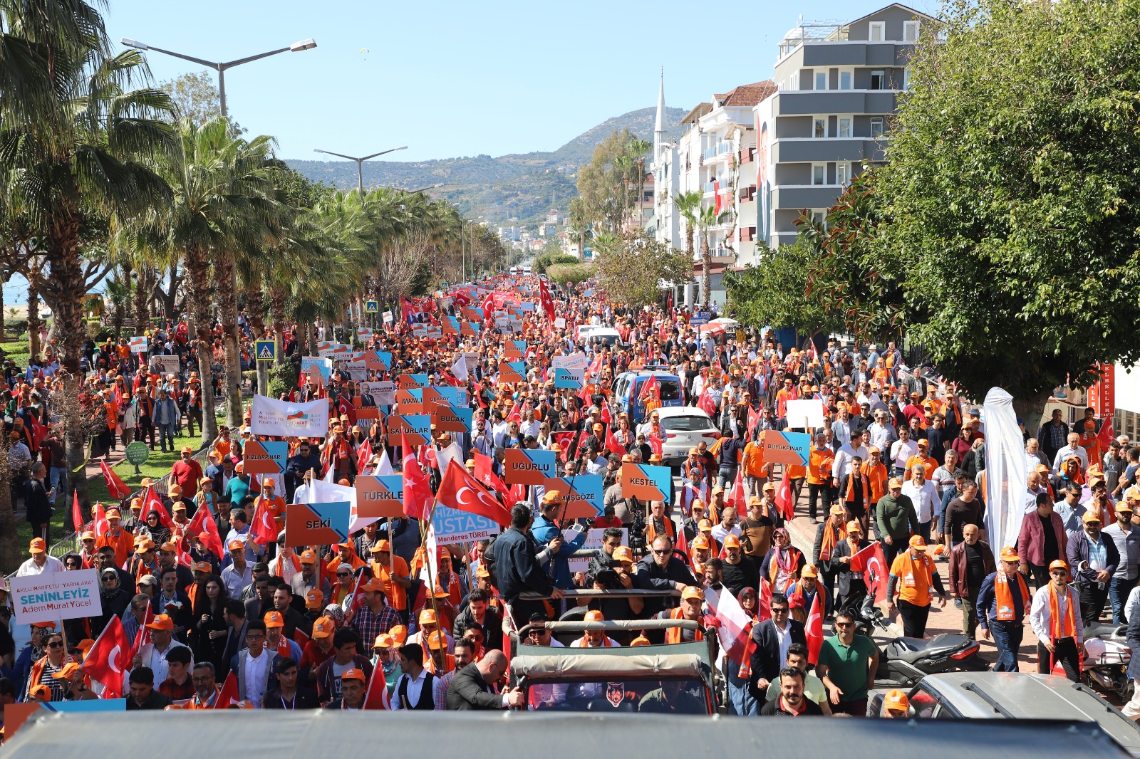 MHP Alanya Belediye Başkanı ve Cumhur İttifakı Başkan adayı Adem Murat Yücel tarafından gerçekleştirilen “Alanya Geleceğine Yürüyor” yürüyüşüne binlerce insan katıldı. Saat 14:00’de Alanya Öğretmenevi önünden başlayan yürüyüşe Dışişleri Bakanı Mevlüt Çavuşoğlu, AK Parti Antalya Milletvekili Sena Nur Çelik, Cumhur İttifakı Antalya Belediye Başkan Adayı Menderes Türel, Cumhur İttifakı Alanya Belediye Başkanı Adem Murat Yücel, MHP ve AK Parti’nin il ve ilçe teşkilatları katıldı. Öğretmenevi önünden başlayan yürüyüşte insan seli yaklaşık 1.5 kilometre uzunluğa ulaştı. Denizde ise tekneler yürüyüşe destek verdi.