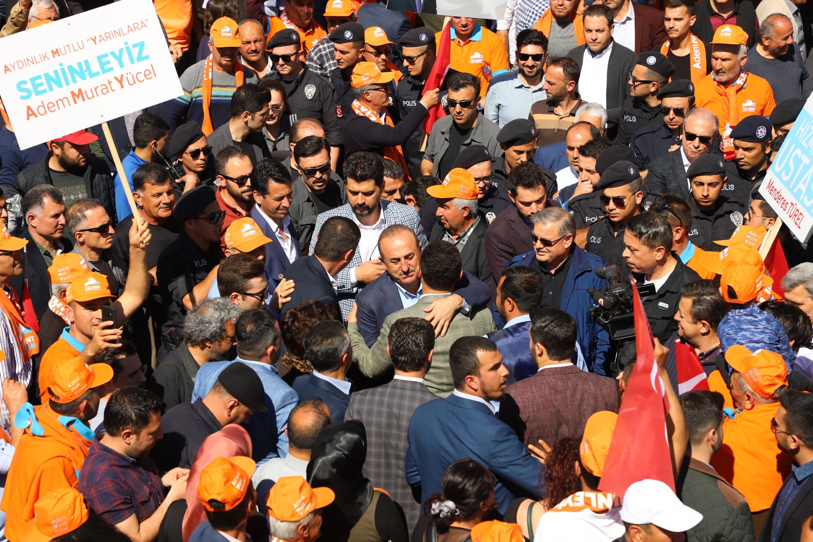 Yücel’in ardından kürsüye Antalya Büyükşehir Belediye Başkanı Menderes Türel çıktı. Türel’de ilk olarak kalabalığın çok olmasına işaret ettiği konuşmasında, “Alanya bugün ne güzelsin maşallah. Sizleri gönülden tebrik ediyorum. Bu muhteşem kalabalık bize 31 Mart’ta yazacağınız destanı müjdeliyor. Sevgili hemşerilerim gece demedik gündüz demedik sizin için çalıştık. Alanya’mıza en önemli hizmetleri yapma gayretleri içerisindeyiz. Adem Murat Yücel ile birlikte el ele Alanya’yı çok güzel günlere taşıyacağız. Biz bu siyasi kampanyada dedik ki projeler yarışsın adaylar yarışmasın. Şimdi buradan ben Alanyalı hemşerilerime soruyorum. Bir Alanya için Karayolları arazisinde muhteşem halka açık bir proje gerçekleştiriyoruz. Yeni bir kültür merkezi yapacağız dedik. Alanya’mıza yeni bir otogar yeni bir millet bahçesi yapacağız dedik. Peki soruyorum rakibim Muhittin Böcek, Alanya ilgili bir proje açıkladı mı?” dedi.