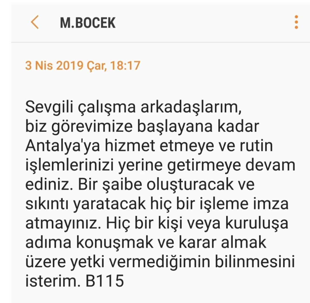 Böcek, mazbata alıp göreve başlayacağı güne kadar geçen süre içinde yaşanacak belirsizliği önlemek için çalışanlarına cep telefonlarından mesaj attı.