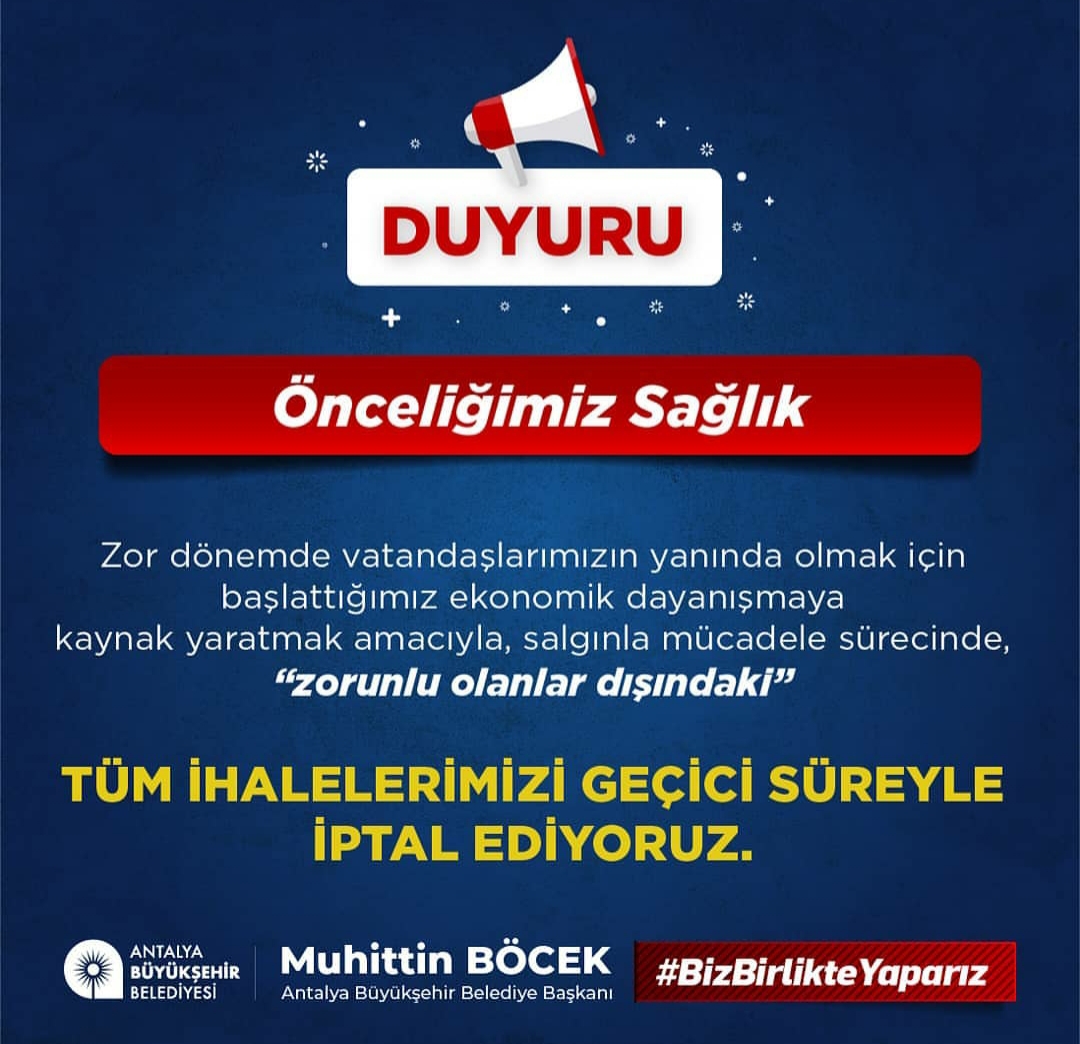Antalya Büyükşehir Belediye Başkanı Muhittin Böcek bugün flaş bir karara imza attı. Sosyal medyadan kararı açıklayan Böcek, “Önce sağlık. Hemşehrilerimizle başlattığımız ekonomik dayanışmaya daha fazla kaynak yaratmak amacıyla ihalelerimizi iptal ediyoruz.” dedi. Güncelleme Tarihi: 30 Mart 2020, 17:44