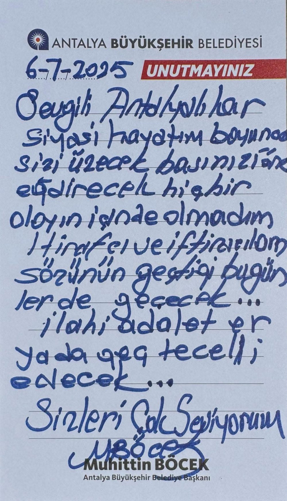 Tutukluluk sürecinde moralinin yüksek olduğu belirtilen Böcek, Antalyalılara da unutulmadıklarını şu sözlerle iletti: “Sizleri çok seviyorum.”
