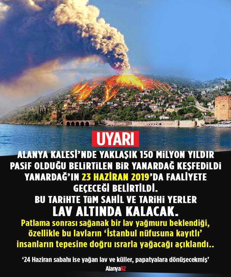 Alanya Kalesi'ni alevler içinde gösteren, 'Uyarı' notu düşülerek, "Alanya Kalesi'nde yaklaşık 150 milyon yıldır pasif olduğu belirtilen bir yanardağ keşfedildi. Yanardağın 23 Haziran 2019'da faaliyete geçeceği belirtildi. Bu tarihte tüm sahil ve tarihi yerler lav altında kalacak. Patlama sonrası sağanak bir lav yağmuru beklendiği, özellikle bu lavların 'İstanbul nüfüsuna kayıtlı' insanların tepesine doğru ısrarla yağacağı