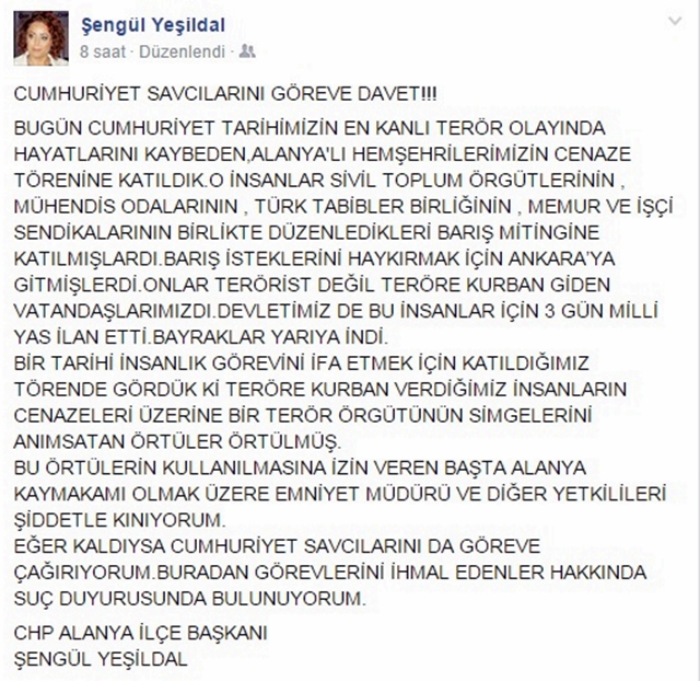 Bugün Cumhuriyet tarihimizin en kanlı terör olayında hayatlarını kaybeden Alanyalı hemşerilerimizin cenaze törenine katıldık. O insanlar sivil toplum örgütlerinin, mühendis odalarının, Türk tabibler birliğinin, memur ve işçi sendikalarının birlikte düzenledikleri barış mitingine katılmışlardı. Barış isteklerini haykırmak için Ankara’ya gitmişlerdi. Onlar terörist değil teröre kurban giden vatandaşlarımızdı. Devletimiz de bu insanlar için 3 gün milli yas ilan etti. Bayraklar yarıya indi.