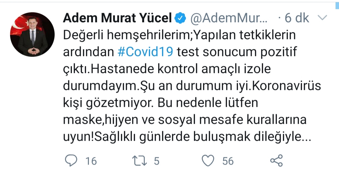 “Değerli hemşehrilerim; yapılan tetkiklerin ardından Covid-19 test sonucum pozitif çıktı. Hastanede kontrol amaçlı izole durumdayım. Şu an durumum iyi. Korona virüs kişi gözetmiyor. Bu nedenle lütfen maske, hijyen ve sosyal mesafe kurallarına uyun! Sağlıklı günlerde buluşmak dileğiyle...” Güncelleme Tarihi: 18 Ağustos 2020, 12:35