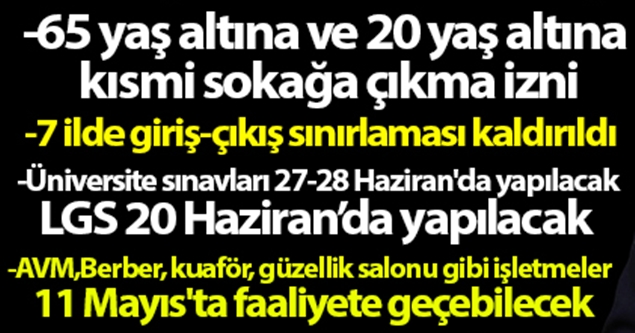 Cumhurbaşkanı Recep Tayyip Erdoğan, "65 yaş üzeri vatandaşlarımız ilk etapta sokağa çıkma sınırlandırılması günlerinin birinde sokağa çıkma getiriyoruz. İlk uygulama 10 Mayıs 11.00- 15.00 saatleri arası olacak"