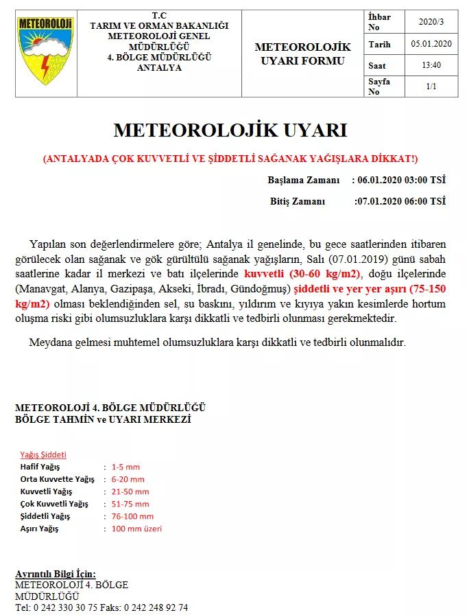 Meteoroloji 4. Bölge Müdürlüğü Antalya ve doğu ilçeleri için bu geceden itibaren şiddetli yağmur ve fırtına uyarısında bulundu.