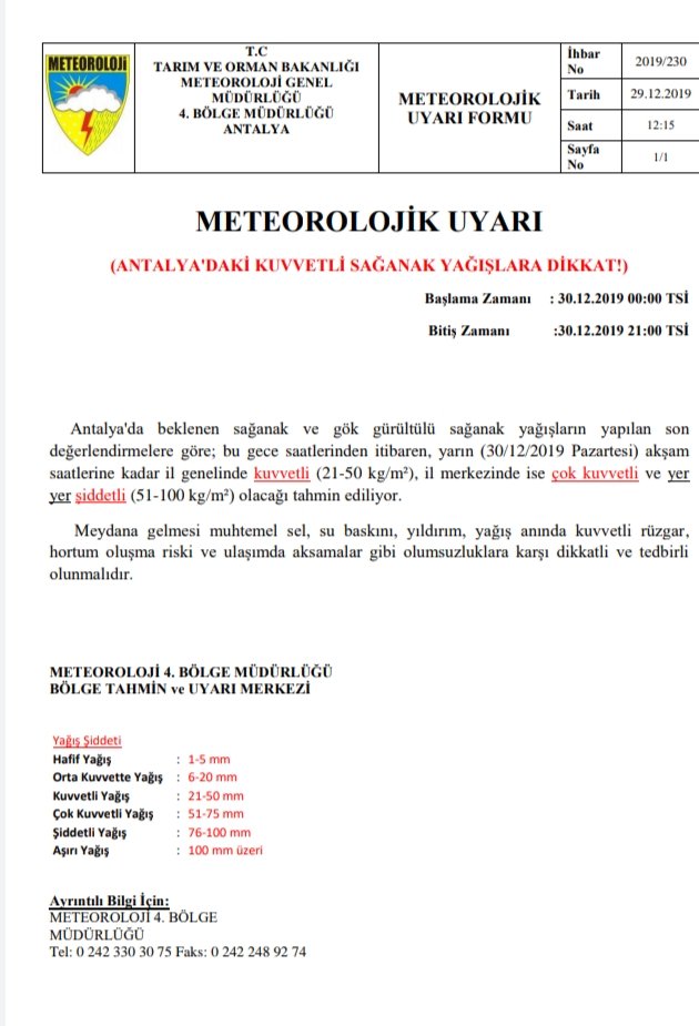 Demre Parçalı çok bulutlu; gece saatlerinden itibaren kuvvetli, yer yer çok kuvvetli ve şiddetli olmak üzere sağanak ve gök gürültülü sağanak yağışlı 6 15