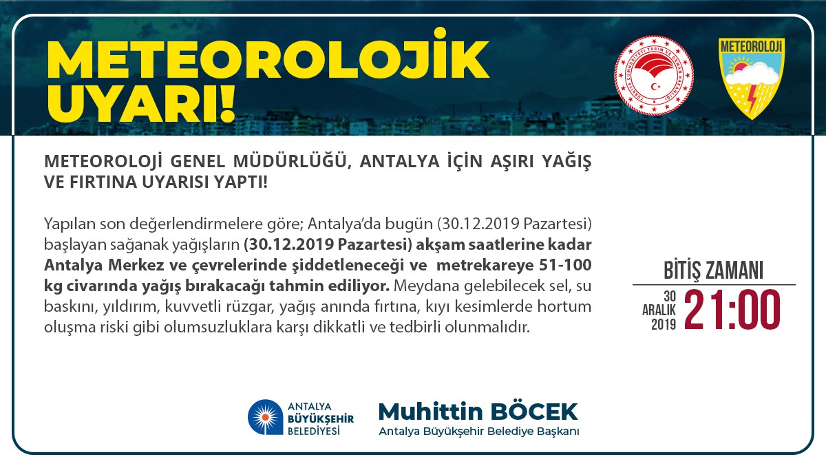 Meteoroloji 4. Bölge Müdürlüğü'ne göre Antalya'da hava bugün Parçalı çok bulutlu; gece saatlerinden itibaren Antalya ilinde kuvvetli, yer yer çok kuvvetli ve şiddetli olmak üzere sağanak ve gök gürültülü sağanak yağışlı, iç kesimlerde gece saatlerinden itibaren yer yer yoğun olmak üzere kar yağışlı geçecek.