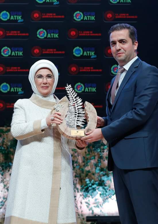 Cumhurbaşkanı Recep Tayyip Erdoğan'ın eşi Emine Erdoğan, İstanbul'da düzenlenen törenle Sıfır Atık Yerel Yönetimler Ödülü'nü Alanya Belediye Başkan Yardımcısı Tunahan Kasapoğlu'na verdi.