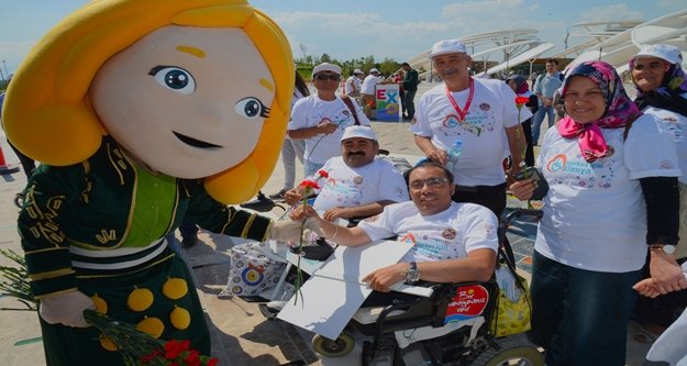 10-16 Mayıs Engelliler Haftasının ilk günü Alanya Belediyesi Engelsiz Park ve Yaşam Merkezi’ne kayıtlı engelli birey ve yakınları EXPO 2016 Antalya sergi alanını gezdi. Sergi alanı girişinde EXPO 2016’nın sevimli maskotları Ece-Efe tarafından karşılanan engelli bireyler ve aileleri EXPO 2016 Antalya gönüllülerinin de yardımıyla sergi alanını gezdi. Engelli bireyler gezi boyunca ellerinde taşıdıkları dövizlerle engelli haftasına dikkat çeken mesajlar verdi.