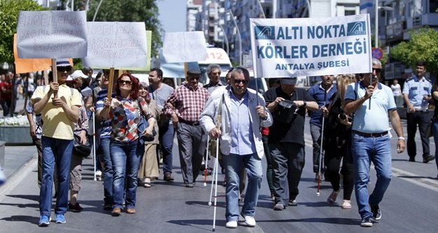Altı Nokta Körler Derneği Antalya Şubesi üyeleri 10-16 Mayıs Dünya Engelliler Haftası 'na farkındalık oluşturmak amacıyla Aydın Kanza Parkı'ndan Cumhuriyet Meydanı’na ellerindeki dövizler eşliğinde yürüdü. Yürüyüşe az sayıda engelli vatandaşın katılması dikkatleri çekti.