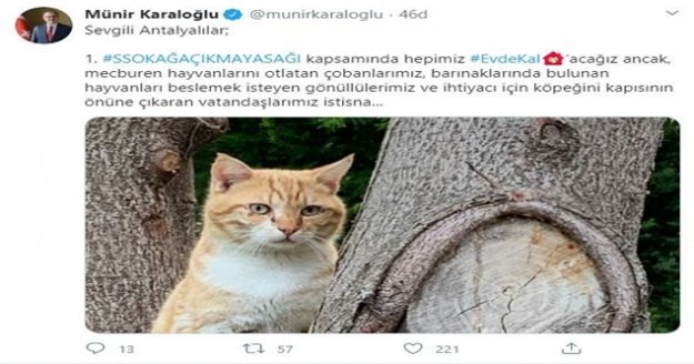Karaloğlu sosyal medyadan yaptığı paylaşımda, “#SSOKAĞAÇIKMAYASAĞI kapsamında hepimiz #EvdeKal’acağız ancak, mecburen hayvanlarını otlatan çobanlarımız, barınaklarında bulunan hayvanları beslemek isteyen gönüllülerimiz ve ihtiyacı için köpeğini kapısının önüne çıkaran vatandaşlarımız istisna. İlçe Kaymakamlarımız, Belediye başkanlarımız ve sahada görev yapan kolluk kuvvetlerimizden bu tür mecburiyeti olan vatandaşlarımızı istisna olarak değerlendirmelerini ve kolaylık sağlamalarını rica ederim. " ifadelerini kullandı.