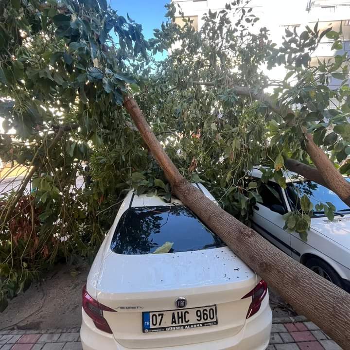 Alanya'nın Güllerpınarı Mahallesi Kaptaner Sokak’ta etkili olan fırtına, büyük bir hasara yol açtı. Fırtına nedeniyle sokakta bulunan kauçuk ağacı kökünden sökülerek, park halindeki araçlara zarar verdi. Olayda araçların camları kırılırken, ağaç parçaları da çevreye yayıldı.