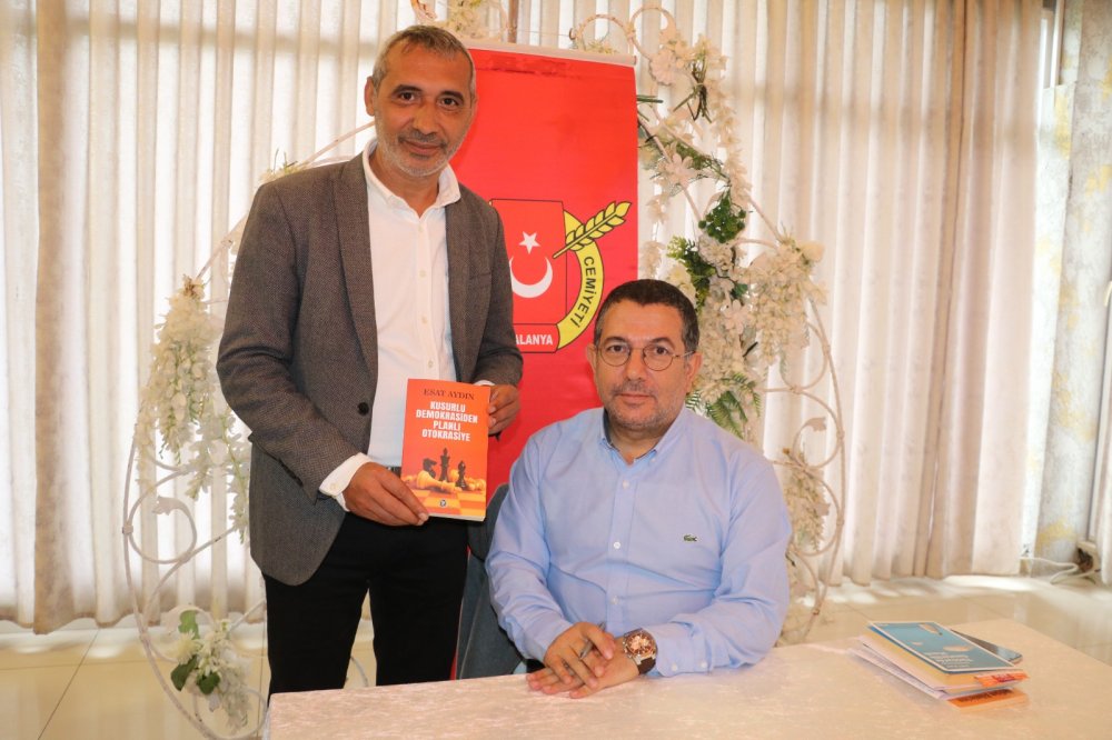 Esat Aydın, yaklaşık 1 saat süren söyleşinin sonunda "Kusurlu Demokrasiden Planlı Otokrasiye" adlı kitabını imzaladı.