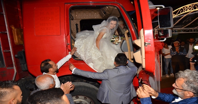 Daha önce hazırladıkları gelin arabası yerine kuzenlerinin hazırladığı gelin arabası olan kamyona binerek düğün salonuna gelen gelin ve damada vatandaşlar yol boyunca sevgi gösterisinde bulundu. Hazırlanan gelin arabası ise kamyona eskortluk yaptı.