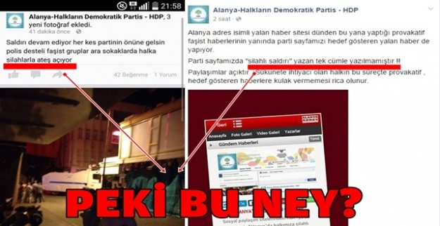 Dün Alanya'da gerçekleşen olaylar esnasında HDP Alanya İlçe Örgütü'nün sayfasından bir çok kışkırtıcı mesaj yayınlanmış bu mesajlar vatandaşları galeyena getirerek olayların büyümesine sebep olmuştu. Hatta sayfayı yöneten kişiler oldukça ileri giderek vatandaşların ve polislerin ortak olarak kendilerine silahlı saldırıda bulunduklarını iddia etmişlerdi.