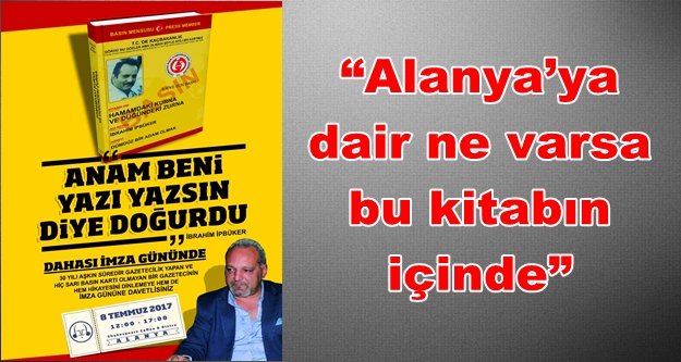 Alanya Gazeteciler Cemiyeti (AGC) Üyesi ve Gerçek Alanya Gazetesi Genel Yayın Yönetmeni İbrahim İpbüker, ‘Hamamdaki Kurna ve Düğündeki Zurna’ isimli ikinci kitabı için 8 Temmuz Cumartesi saat 12.00-17.00 arasında Shakespeare Bistro&Cafe’de imza günü düzenliyor. Yazarın, Alanya konulu köşe yazılarından oluşan ilk kitabı ‘Alanya Yazıları’ okuyucudan büyük ilgi görmüştü. ‘Anam beni yazı yazsın diye doğurdu’ düsturuyla ikinci kitabını da okuyucuyla buluşturan yazar, “Alanya’ya dair ne varsa bu kitabın içinde” diyerek tüm okuyucuları imza gününe davet etti. Yazar ayrıca, imza gününe ev sahiplği yapan Shakespeare Bistro&Cafe’ye de teşekkür etmeyi ihmal etmedi.