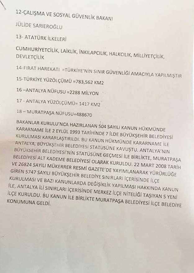 Mygazete.com'dan Cüneyt Bo'un haberine göre; Antalya Büyükşehir Belediyesi’nde kadroya geçmek için başvuruları kabul edilen, 6 bin 189 işçiye yöneltilen mülakat sorularına ulaşıldı. “Kim 500 milyar ister” programındaki soruları aratmayan listede, ‘Mimar Sinan’ın ilk ustalık eseri hangisidir’, ‘Ateşten gömlek, Türk’ün ateşle imtihanı’ vurun kahpeye kitaplarının yazarı kimdir;’, ‘Kuran’ı Kerim ne zaman indi’, ’15 Temmuz darbesi girişiminde kaç kişi şehit oldu’, ‘La Selencechez Les Turcs Ottomans adlı eseri yazan bilim tarihçimiz kimdir?’ gibi sorular yer alıyor.